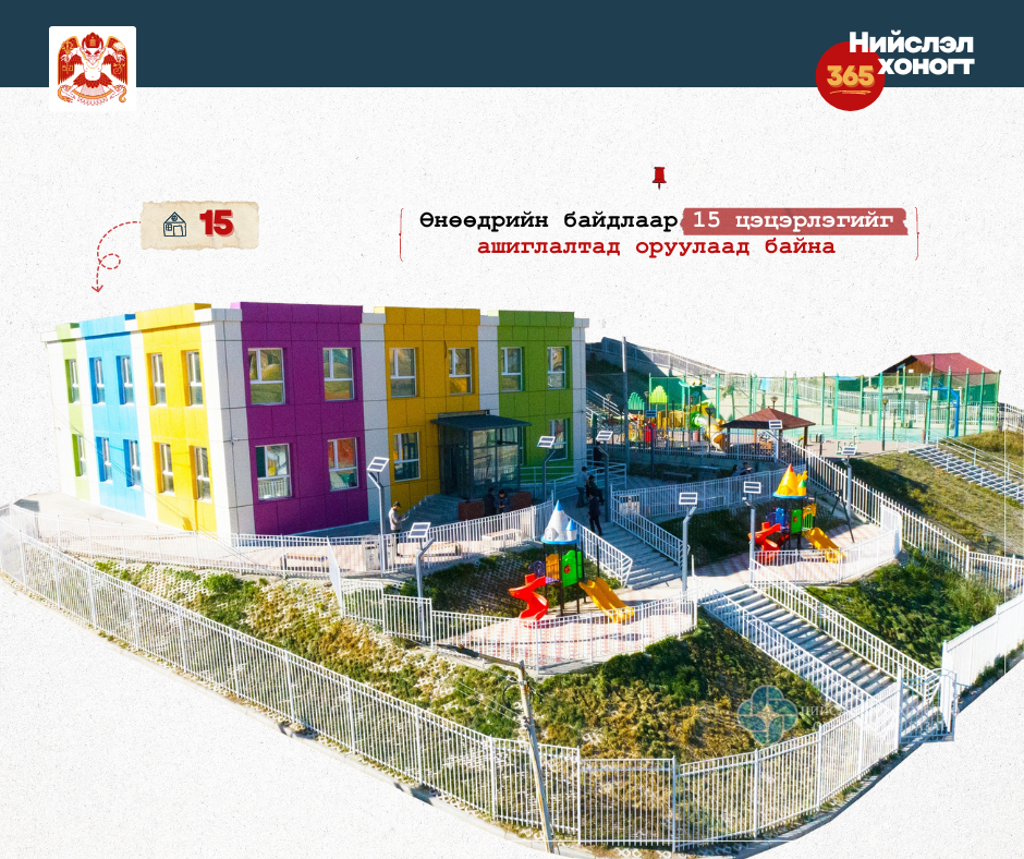 - СХД-ийн 7 дугаар хороонд 150 ортой шинэ цэцэрлэгийн барилга угсралт, дотор засал, гадна тохижилт, инженерийн шугам, сүлжээ холболтын ажил бүрэн дуусгаж, ашиглалтад орууллаа. Тус цэцэрлэгийн барилга нь хоёр давхар бөгөөд заах арга зүйн танхим, эмчийн өрөө, ариун цэврийн өрөө, агуулах, ажилчдын хувцас солих өрөө, бэлтгэлийн өрөө, халуун цех, сургалтын заал, багш, ажилчдын амрах өрөөг гаргаж өгсөн юм.