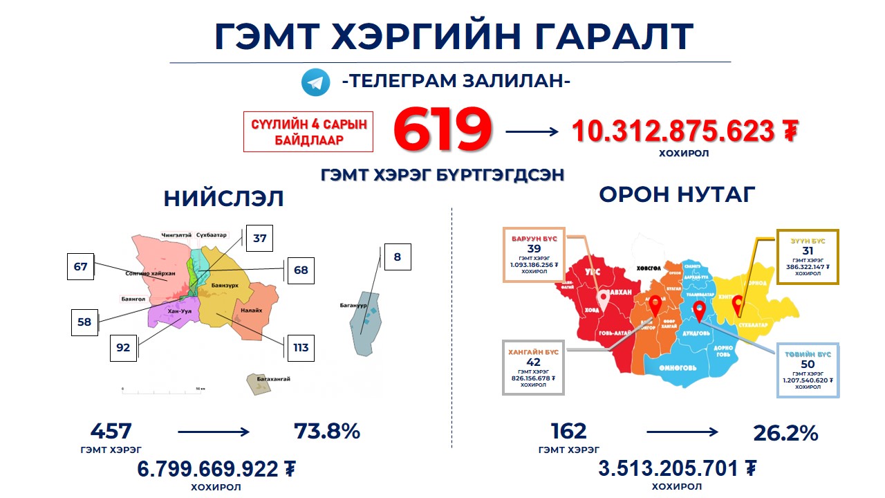 Манай улсад сүүлийн 4 сарын байдлаар “Телеграм залилан”-тай холбоотой нийт 619 гэмт хэрэг бүртгэгдэж, иргэдэд 10,3 тэрбум төгрөгийн мөнгөн хохирол учирсан байна. Энэ төрлийн гэмт хэрэгтэй тэмцэх чиглэлээр Цагдаагийн Ерөнхий газар нь холбогдох байгууллагуудтай хамтран шат дараалсан ажил, арга хэмжээг зохион байгуулж байна. Үүний хүрээнд "Телеграм" платформ ашиглан үйлдэгдэж буй залилах гэмт хэргээс урьдчилан сэргийлэх чиглэлээр өнөөдөр /2024.11.04/ мэдээлэл хийлээ.