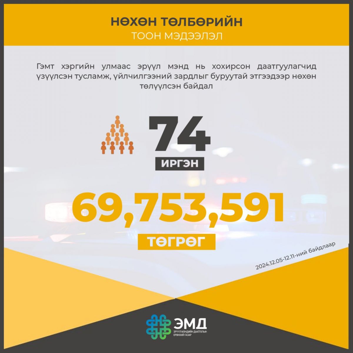 Тэгвэл 2024 оны 12 дугаар сарын 5-наас 12 дугаар сарын 11-ний өдрүүдэд 74 даатгуулагч-иргэнд ЭМД-ын сангаас 69 сая 753 мянга 591 төгрөг зарцуулсныг хуулийн хүрээнд буруутай этгээдээр нөхөн төлүүлж, ЭМД-ын санг хохиролгүй болголоо.
