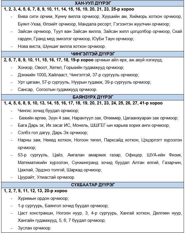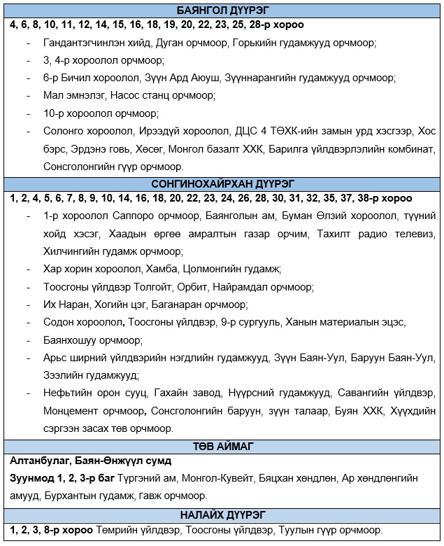 Эрчим хүчний чадлын дутагдлаас шалтгаалан 2024 оны арванхоёрдугаар сарын 20-ны Баасан гарагийн 10:00-23:00 цагийн хооронд “Хязгаарлалт хийж болзошгүй” байршлуудыг мэдээлж байна.