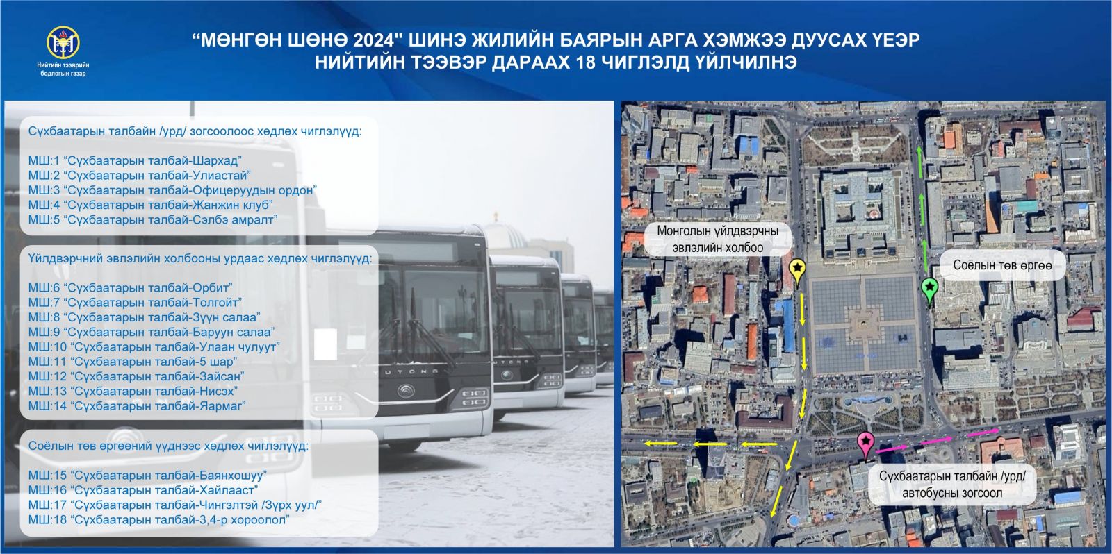 -МШ:15 “Сүхбаатарын талбай-Баянхошуу” гэсэн 18 чиглэлд Д.Сүхбаатарын талбайгаас нийтийн тээврийн автобусаар иргэд үнэ төлбөргүй үйлчлүүлнэ.
