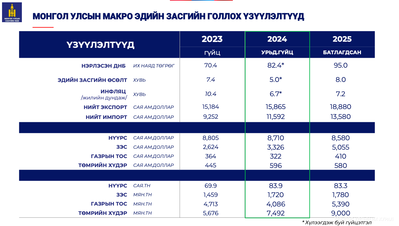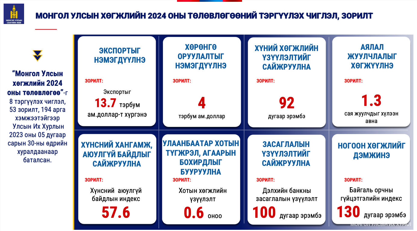Тэрбээр мэдээллийнхээ эхэнд Хөгжлийн бодлого, төлөвлөлт, түүний удирдлагын тухай хуульд заасан Монгол Улсын хөгжлийн бодлогын баримт бичгүүдийн талаар дурдаад, Монгол Улсын хөгжлийн 2024 оны төлөвлөгөөний тэргүүлэх чиглэл, зорилт болон макро эдийн засгийн голлох үзүүлэлтүүдийг 2023, 2024 оны гүйцэтгэл, энэ оны төлөвлөлтийн талаар дэлгэрэнгүй танилцууллаа.