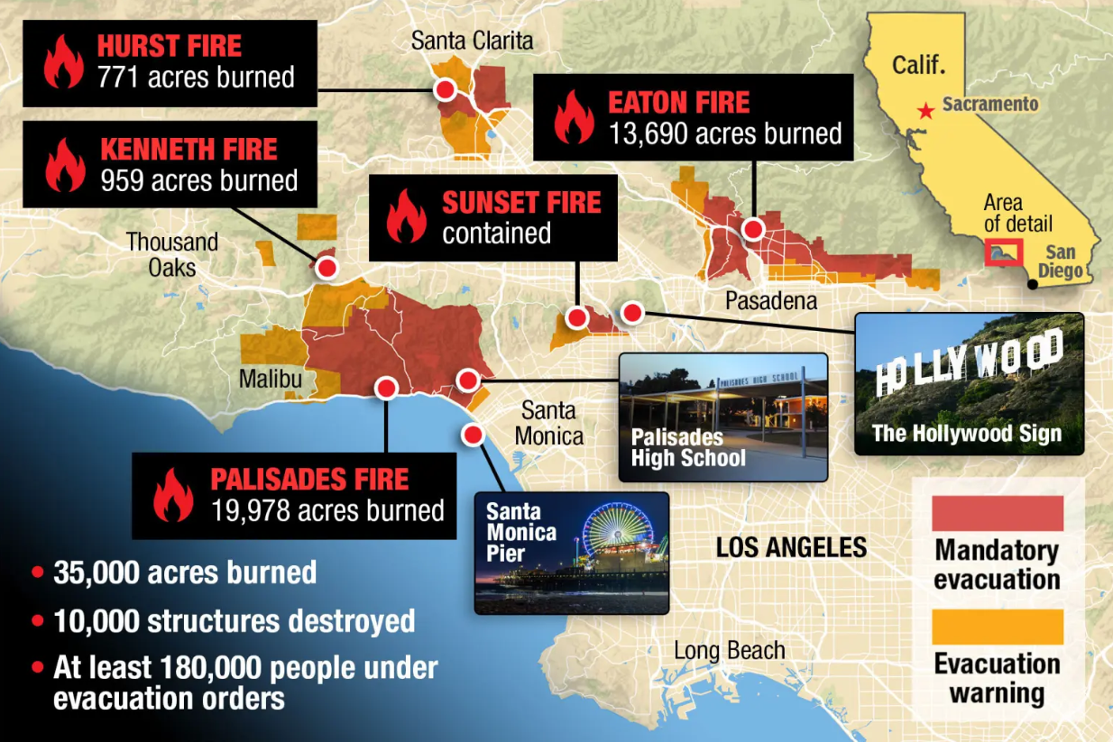 АНУ-ын Лос Анжелес хотод гал түймэр дэгдэж Палисадс, Итон, Херст зэрэг нийт таван газар үргэлжилсээр байна. Орон нутгийн цагаар өнгөрөгч мягмар гарагт эхэлсэн уг гал түймэрт Лос Анжелес хотын нийт 35.000 акр талбай буюу ойролцоогоор Дархан хотын нутаг дэвсгэртэй тэнцэхүйц хэмжээний газар нутаг шатаад байна.