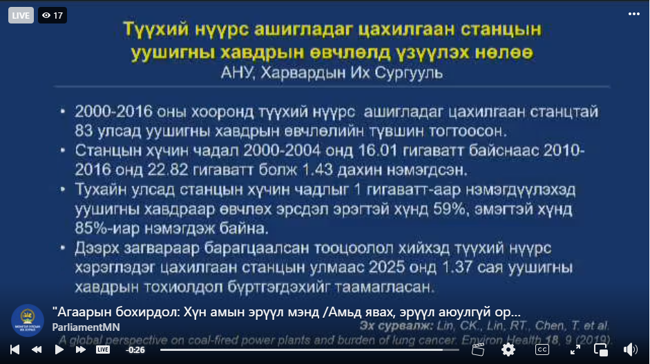 Уг хэлэлцүүлгийн үеэр түүхий нүүрс ашигладаг цахилгаан станц нь уушгины хавдар өвчинд хэрхэн нөлөөлдөг болох тухай судалгаа танилцууллаа. Уг судалгаан нь АНУ-ын Харвардын их сургуульд хийгдсэн судалгаа бөгөөд түүхий нүүрс ашигладаг цахилгаан станцын хүчин чадлыг 1гигаваттаар нэмэгдүүлэхэд уушгины хавдраар өвчлөх эрсдэл эрэгтэй хүнд 59 хувь, эмэгтэй хүнд 85 хувиар нэмэгддэг байна.