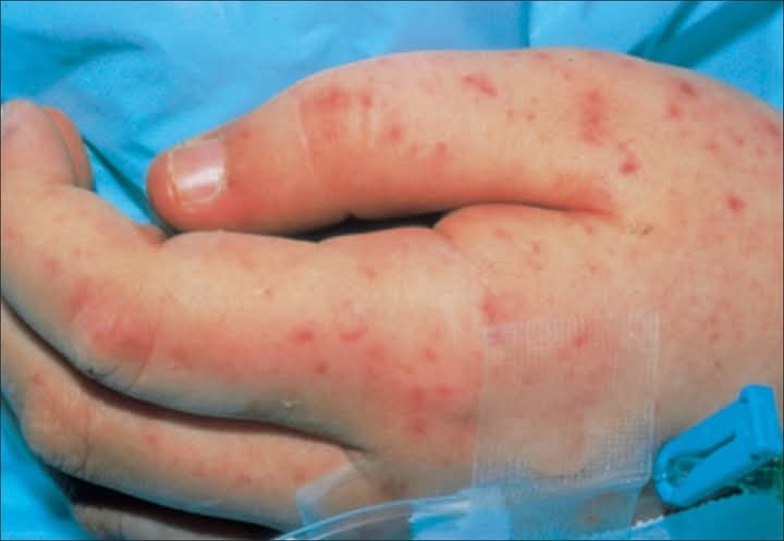 Цусархаг тууралт: Хонго, гуя, гар, мөч, цээж, нүүр, нүдний зовхи хэсгээр цэгэн болон од хэлбэрийн цус харвалтууд үүснэ. Тууралт халуурч эхэлснээс хойш 6-8 цагийн дараа ажиглагдана. Том хэмжээний цус харвалтууд эцэстээ үхжилт үүсгэдэг.
