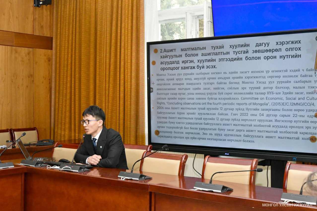 Хуралдааны эхэнд ашигт малтмалын тухай хуулийн хэрэгжилтийн үр дагаврын үнэлгээ, судалгааны тайланг Хууль зүйн ухааны магистр, хуульч, өмгөөлөгч Р.Хатансайхан танилцуулав.
