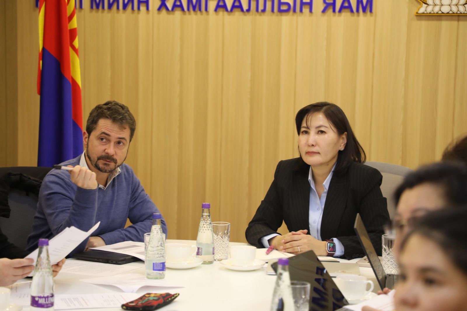 Гэр бүл, хөдөлмөр, нийгмийн хамгааллын яам, Нийгмийн даатгалын ерөнхий газрын холбогдох мэргэжилтнүүд Дэлхийн банкны ахлах эдийн засагчтай хамтран тэтгэврийн шинэчлэлийн бодлогын хувилбаруудын актуар тооцоололын үр дүнг хэлэлцэж, холбогдох судалгаа, тооцооллыг хамтран хийж байна.