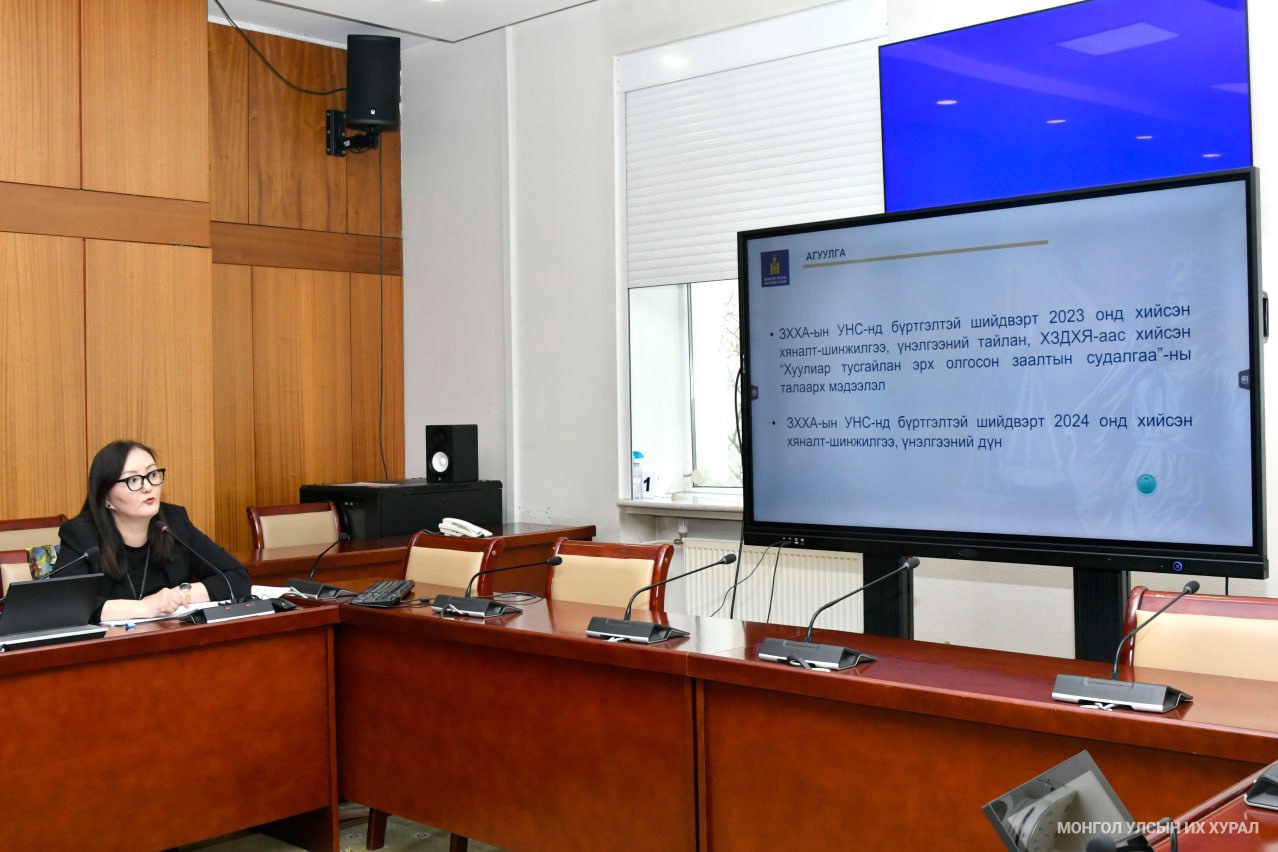 УИХ-ын даргын 2024 оны 75 дугаар захирамжаар байгуулагдсан Нийтээр дагаж мөрдөх дүрэм, журам, захиргааны хэм хэмжээний актын тоог цөөрүүлэх, цэгцлэх талаар санал, дүгнэлт гарган холбогдох бусад хууль тогтоомжийн төсөл боловсруулах үүрэг бүхий ажлын хэсгийн өнөөдрийн /2025.04.08/ хуралдаанаар “Улсын нэгдсэн санд бүртгэлтэй шийдвэрт хяналт-шинжилгээ, үнэлгээ хийсэн дүн, хуулиар тусгайлан эрх олгосон заалтын судалгаа”-ны талаарх мэдээллийг сонслоо.