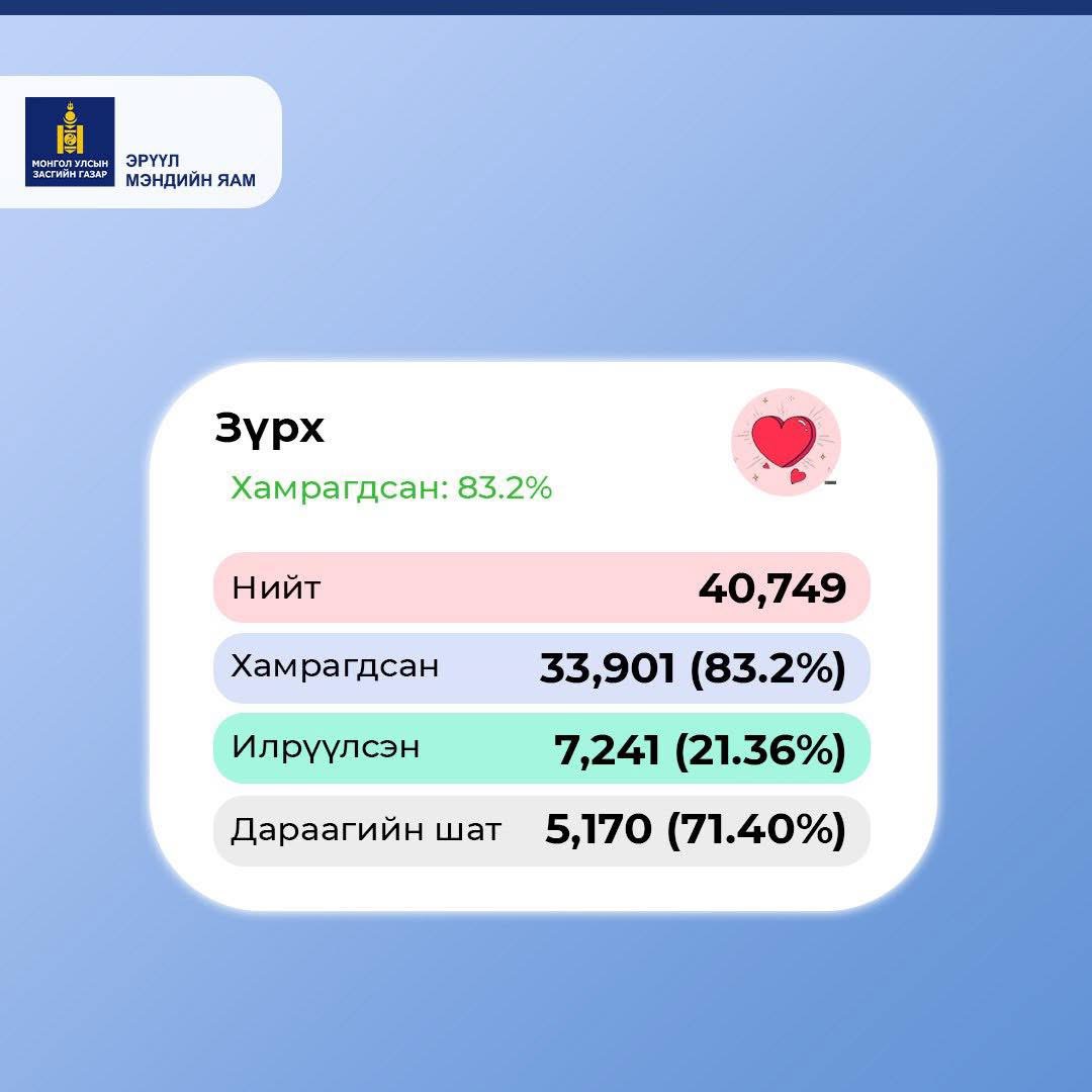 Эрүүл мэндийн сайдын “Сургуульд суурилсан эрт илрүүлгийн тогтолцоог сайжруулах” бодлогын хүрээнд 2024-2025 оны хичээлийн жилд нийслэлийн хэмжээнд нэгдүгээр ангид элсэн суралцаж буй 33901 хүүхдийг зүрхний эмгэг илрүүлэх үзлэгт хамруулаад байна.