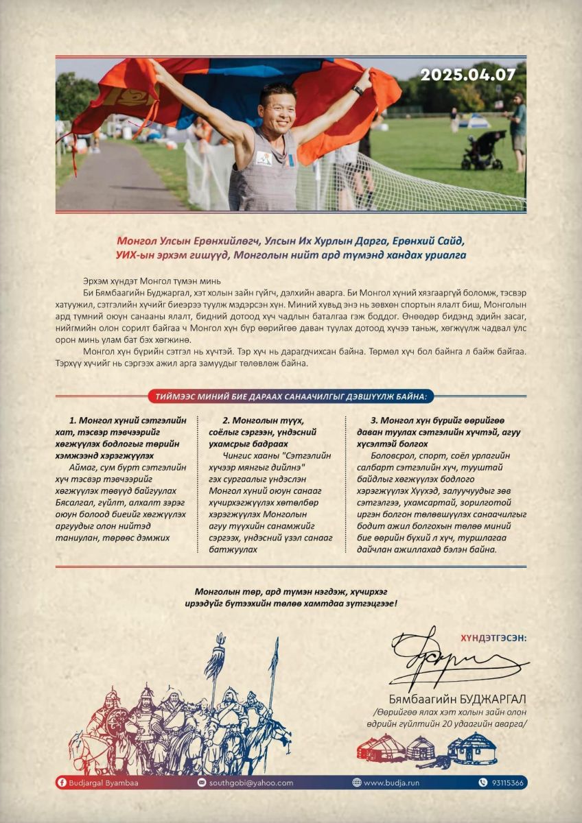 -Миний энэхүү уриалгыг төрийн гурван өндөрлөг болон холбогдох байгууллагууд анхаарч үзэхгүй байж болно. Гэхдээ энэ бол зөвхөн төр засагт хандсан уриалга биш, нийт Монголын ард түмэнд хандаж буй уриалга юм. Өөрчлөлт, хөгжил дэвшил нь ганцхан эрх баригчдаас бус, хүн бүрийн оролцооноос хамаардаг. Би хувь хүний түвшинд ч, нийгмийн түвшинд ч бусдад үлгэрлэж, урам зориг өгч, дэмжлэг үзүүлэхэд үргэлж бэлэн. Өөрийн хүч бололцоонд тулгуурлан, хүмүүсийг өөрийгөө ялан дийлэхэд нь урамшуулж, алхалт, гүйлт зэрэг арга барилаараа үлгэр дуурайл үзүүлнэ. Миний хувьд ухрах, зогсох шалтгаан байхгүй. Хэрэв хамтран ажиллах хүсэлтэй хүн, байгууллага байвал илүү өргөн хүрээтэй, олон хүнд хүрэхүйц ажил зохион байгуулах боломжтой. Монгол түмний саруул ухаан, өөрийгөө даван туулах эрмэлзэл, хүч чадалд би итгэдэг. Тиймээс төрийн гурван өндөрлөг, төрийн түшээд болон ард иргэддээ энэ уриалгыг дахин хүргэж байна.