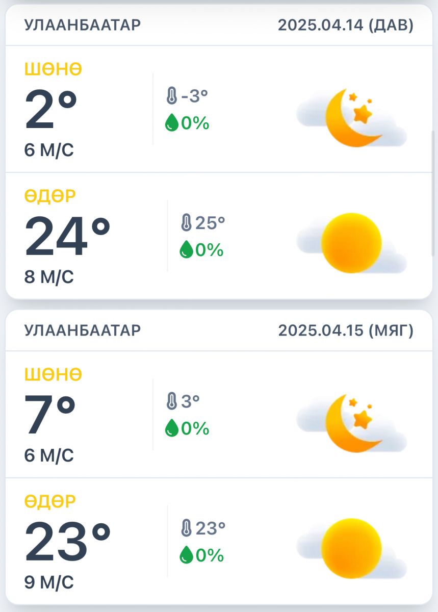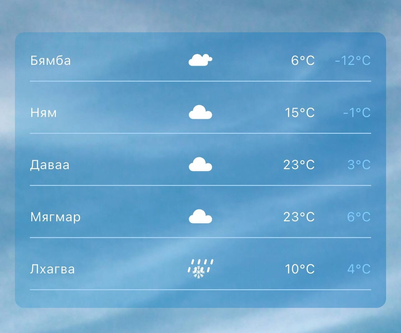 Өнөөдөр Улаанбаатар хотод үүлшинэ. Хур тунадас орохгүй. Салхи баруун хойноос секундэд 5-10 метр. Агаарын температур +12...+14 градус дулаан байна. Даралт өдөртөө тогтвортой байна.