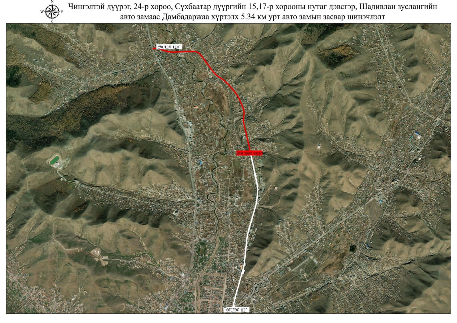 ЧД-ийн 24 дүгээр хороо, СБД-ийн 15, 17 дугаар хорооны нутаг дэвсгэр, Шадивлан зуслангийн авто замаас Дамбадаржаа хүртэлх авто замыг шинэчилж байна. Энэ хүрээнд Шадивлан зуслангийн авто замаас Петровис ШТС хүртэлх 2.7 км урт авто замыг хааж, асфальт бетоноор хучиж байна. Тус авто замыг 5 дугаар сарын 15-ны 06:00 цагт нээнэ.