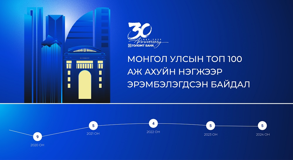 Монгол Улсын Засгийн газар, МҮХАҮТ-аас улсынхаа нийгэм, эдийн засгийн хөгжилд бодитой хувь нэмэр оруулж буй ТОП-100 аж ахуйн нэгжийг 24 дэх жилдээ тодруулж, Голомт банк 22 дахь жилдээ өргөмжлөгдөн 5 дугаарт эрэмбэлэгдлээ. ТОП-100 аж ахуйн нэгжийн шалгаруулалтаар Голомт банк 2024 онд борлуулалтын орлогоор 5-рт, татвар төлөлтөөр 6-рт, даатгуулагчийн тоогоор 4-рт, хөрөнгийн хэмжээгээр 5-рт, мөн нийт ашгийн хэмжээгээр 4-р байрт эрэмбэлэгдсэн байна.
