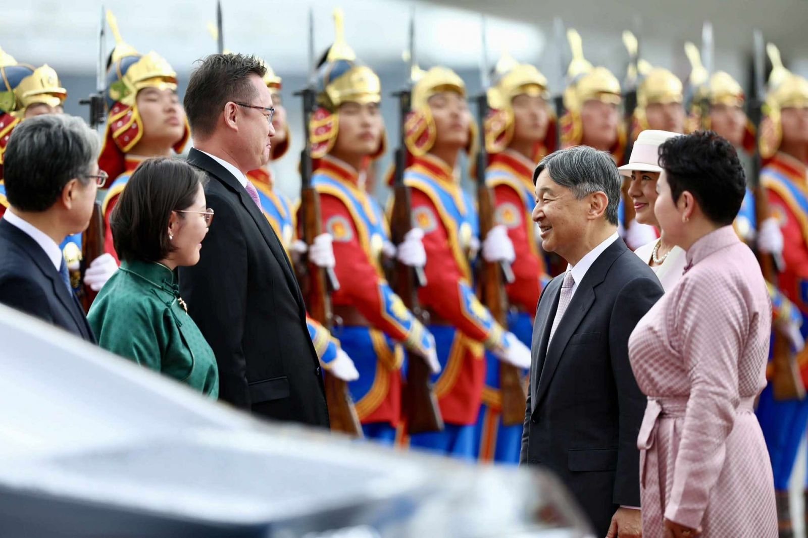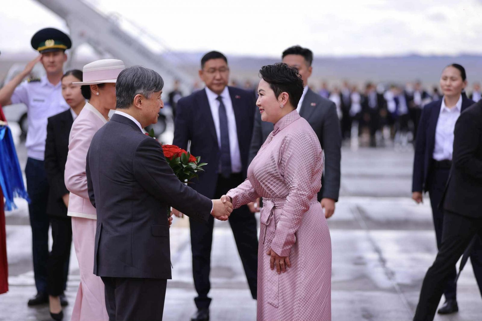 Цог Жавхлант Эзэн Хаан Нарүхито, Эрхэм дээд Хатан Масако нарыг “Чингис хаан” олон улсын нисэх буудалд Гадаад харилцааны сайд Б.Батцэцэг, Монгол Улсаас Япон Улсад суугаа Онц бөгөөд Бүрэн эрхт Элчин сайд Б.Баярсайхан, Япон Улсаас Монгол Улсад суугаа Онц бөгөөд Бүрэн эрхт Элчин сайд М.Игавахара нарын төлөөлөгчид угтлаа.