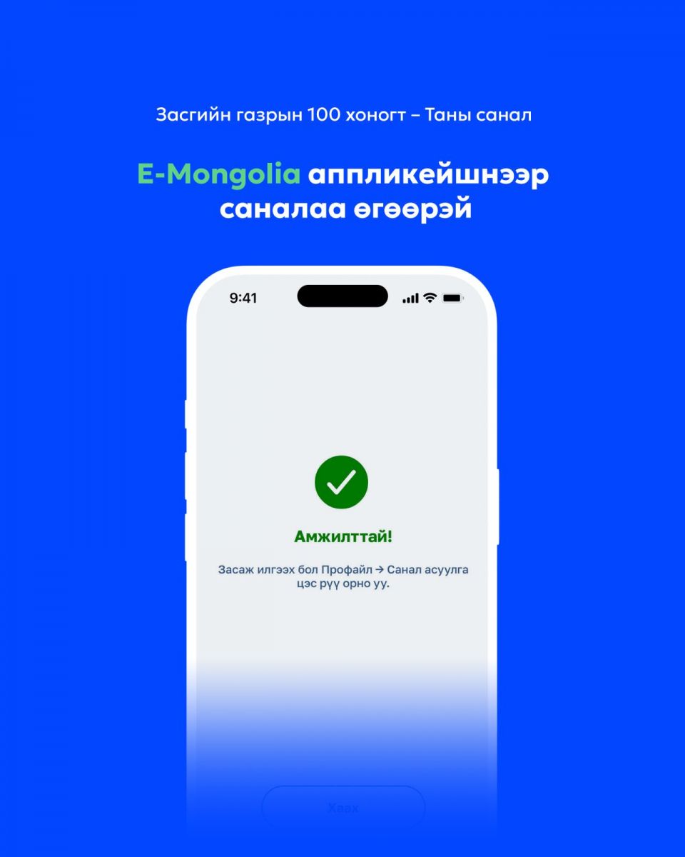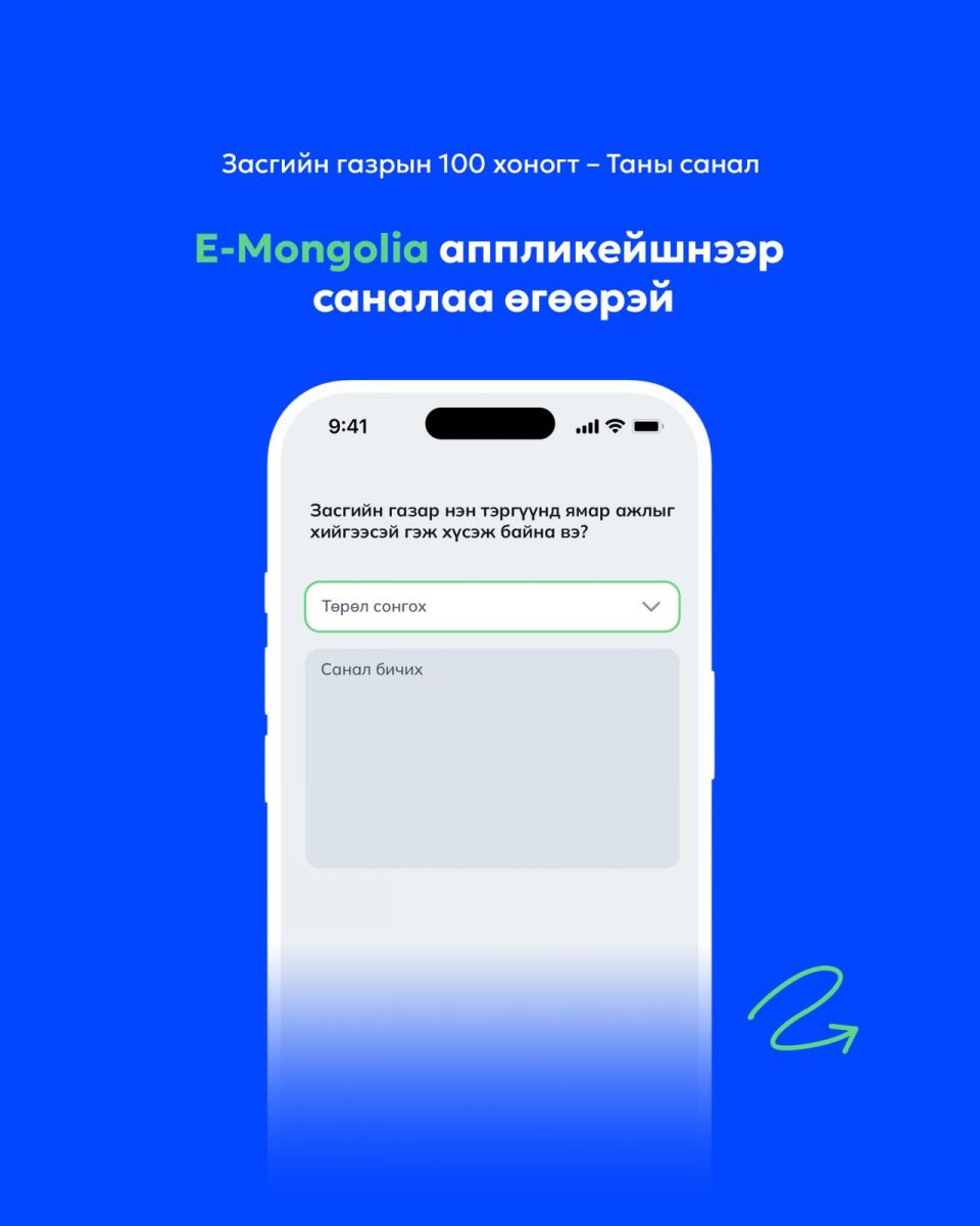 EMongolia системд нэвтэрсэн даруйд санал авах тусгай цонх нээгдэж, иргэн таны саналыг хүлээн авч байна. Мөн иргэд, олон нийтэд үйлчлэх 11-11 төв 24 цагийн турш утсаар, вэб хуудас, фэйсбүүк чатаар иргэдийн саналыг хүлээн авах юм. Засгийн газрын 100 хоногт багтаан хэрэгжүүлэх ажилд иргэд та бүхэн саналаа идэвхтэй өгөхийг уриалж байна.