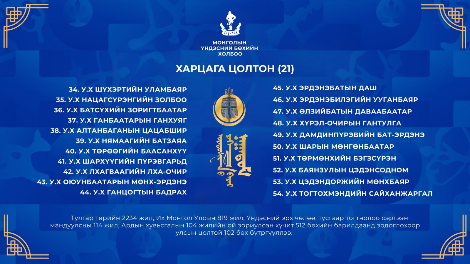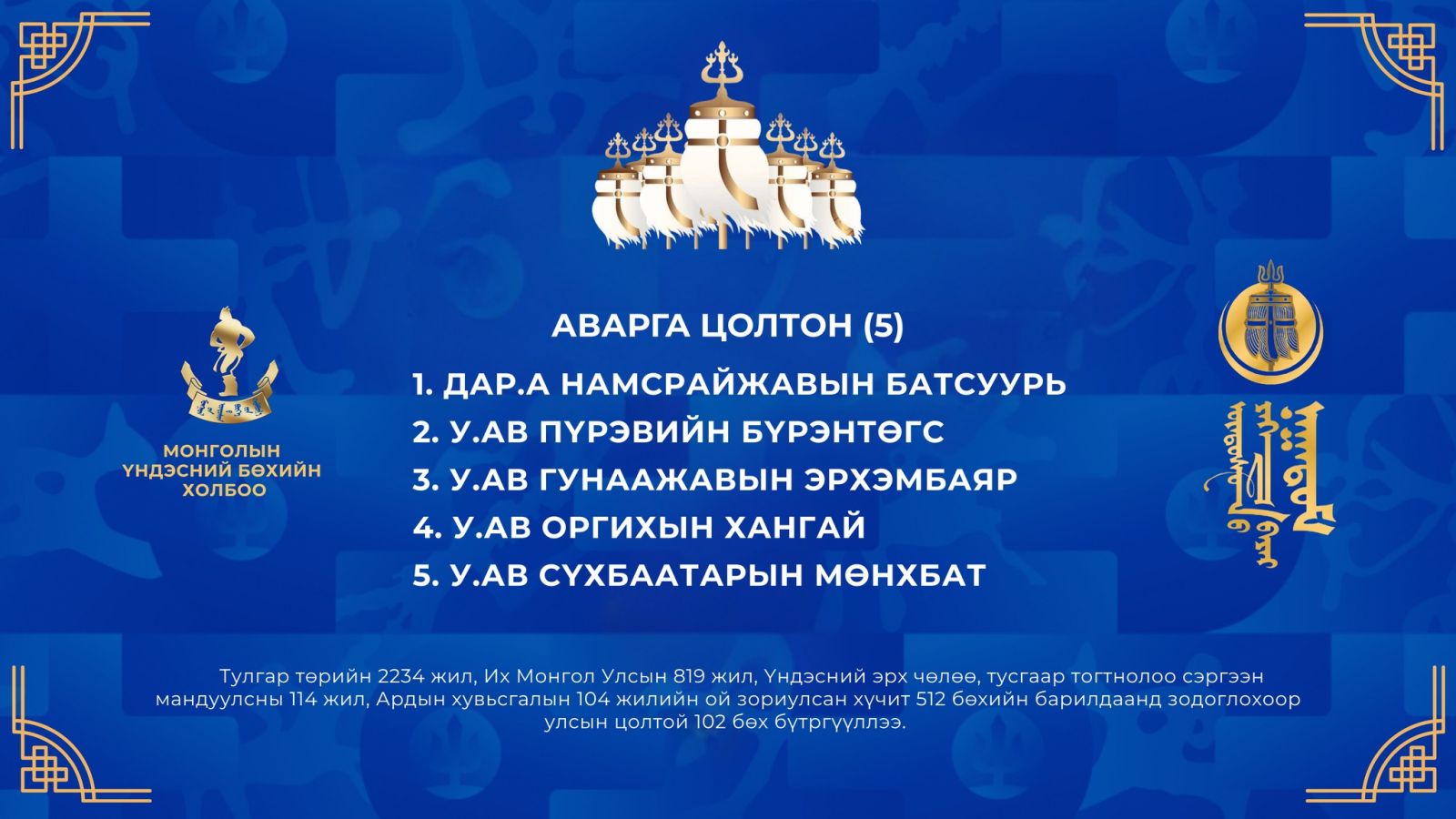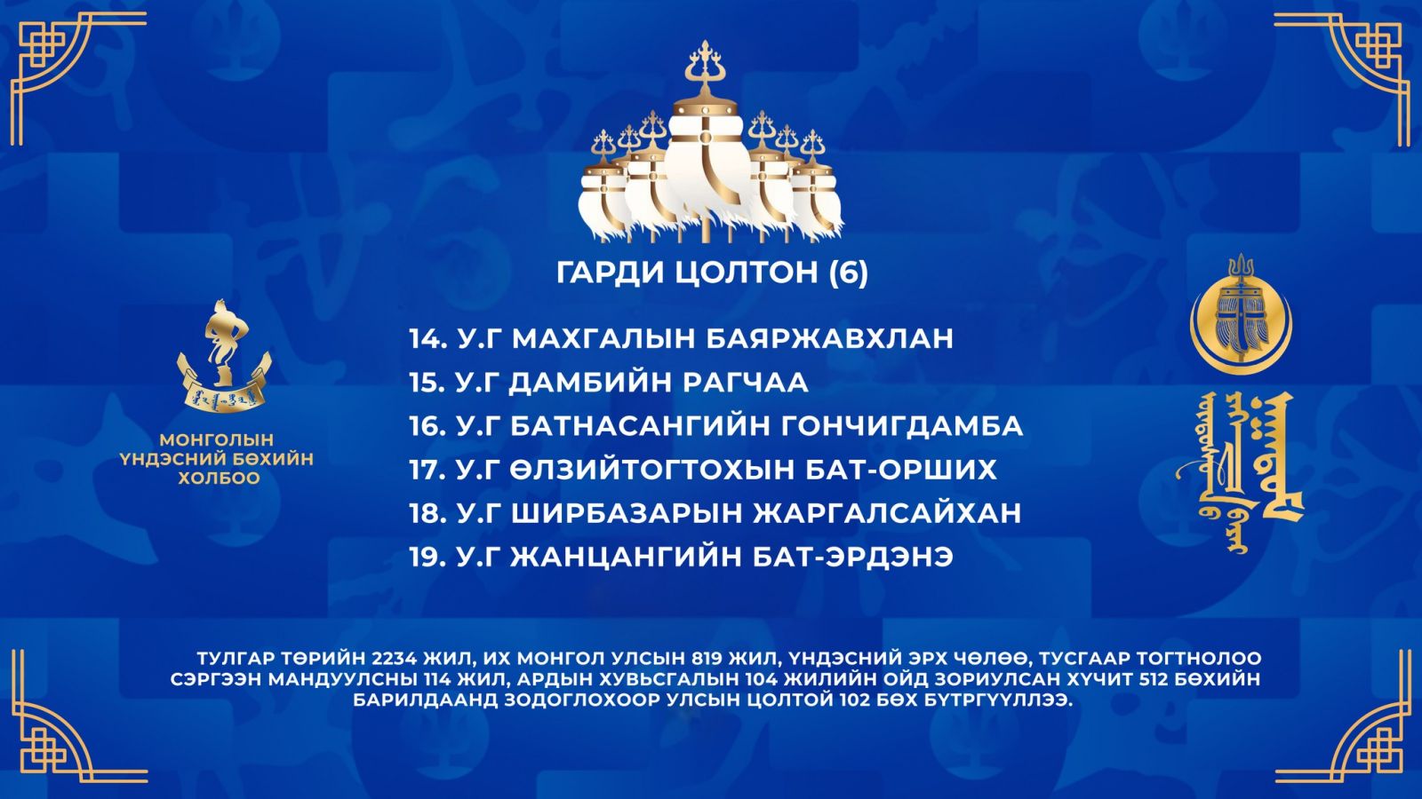 Тулгар төрийн 2234 жил, Их Монгол Улсын 819 жил, Үндэсний эрх чөлөө, тусгаар тогтнолоо сэргээн мандуулсны 114 жил, Ардын хувьсгалын 104 жилийн ой, Үндэсний их баяр наадмын хүчит бөхийн барилдаанд бүртгүүлсэн улсын цолтой бөхчүүдийг танилцуулъя.