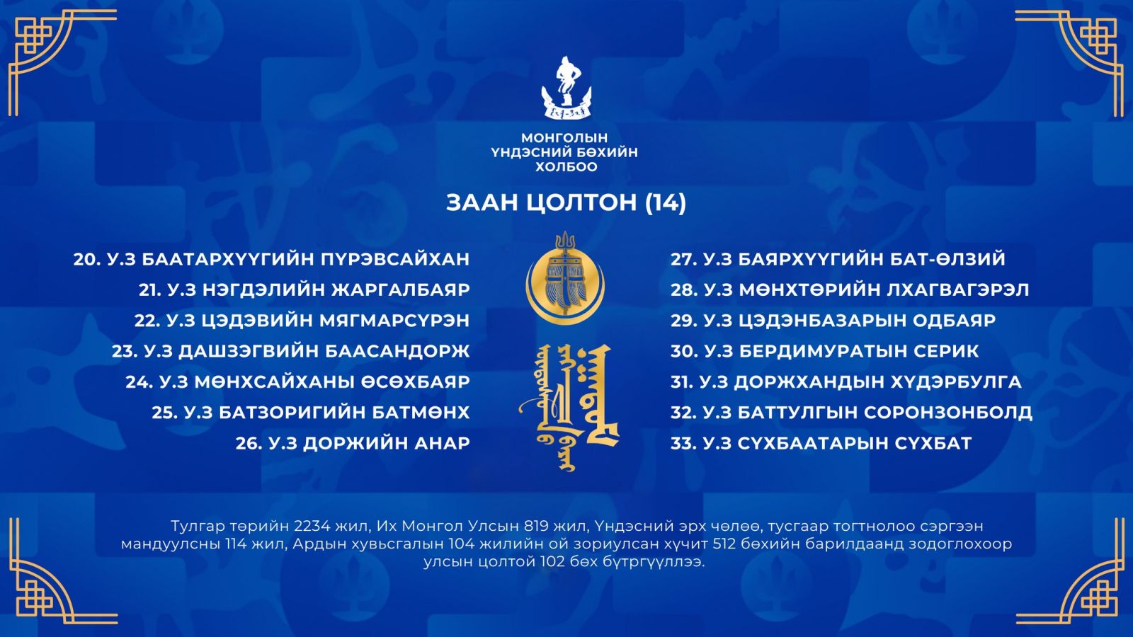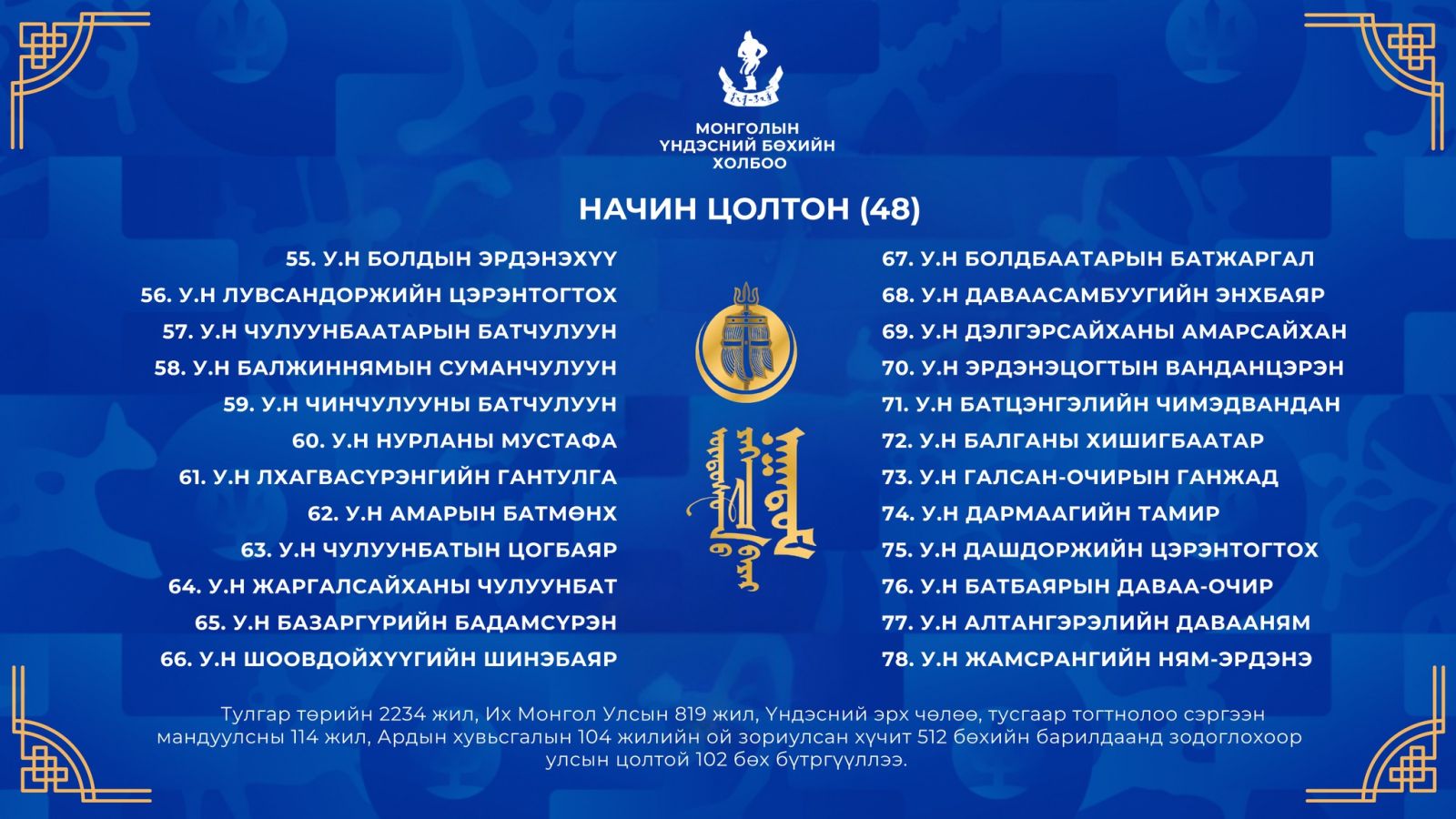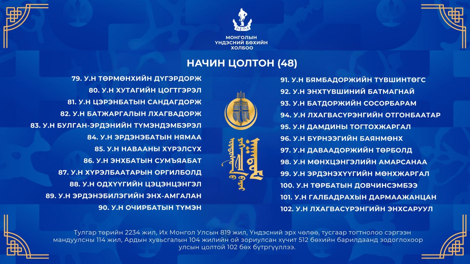 Тулгар төрийн 2234 жил, Их Монгол Улсын 819 жил, Үндэсний эрх чөлөө, тусгаар тогтнолоо сэргээн мандуулсны 114 жил, Ардын хувьсгалын 104 жилийн ой, Үндэсний их баяр наадмын хүчит бөхийн барилдаанд бүртгүүлсэн улсын цолтой бөхчүүдийг танилцуулъя.
