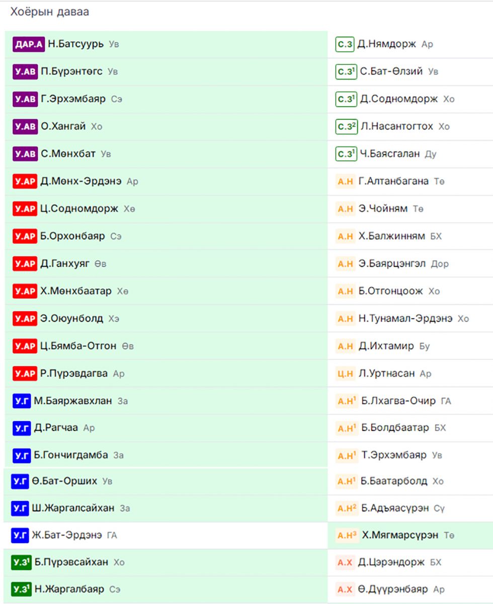 Жич: Дүйзийг www.devjee.mn сайтаас авав. Давсан бөхчүүдийг ногоон сууриар ялгав.