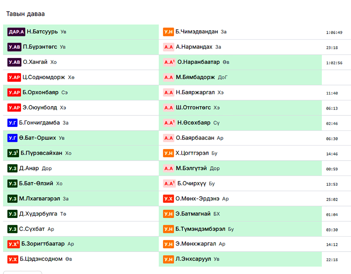 Тэгвэл Улсын арслан Ц.Содномдоржийг аймгийн арслан М.Бямбадорж, Улсын арслан Э.Оюунболдыг аймгийн арслан Ш.Отгонтөгс, Улсын гарьд Б.Гончигдамбыг аймгийн хурц арслан Н.Өсөхбаяр, Улсын заан Д.Анарыг аймгийн арслан М.Бэлгүтэй нар тус тус давж, Улсын начин цолны босго даваад байна.