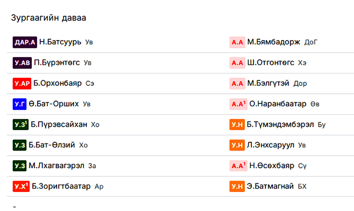 Таван бөх шинээр улсын цолны болзол хангаж тав даваад зургаагийн даваанд барилдана.Энэ даваанд улсын заан М.Лхагвагэрэл гурван бөхөөс аймгийн арслан Н.Өсөхбаярыг амласнаар улсын харцага Б.Зоригтбаатар, улсын начин Э.Батмагнай нар тунаад байна. Хоёр бөх албан ёсны барилдаанд 6 удаа таарахад Э.Батмагнай 4 давж, Б.Зоригтбаатар 2 давж байжээ.