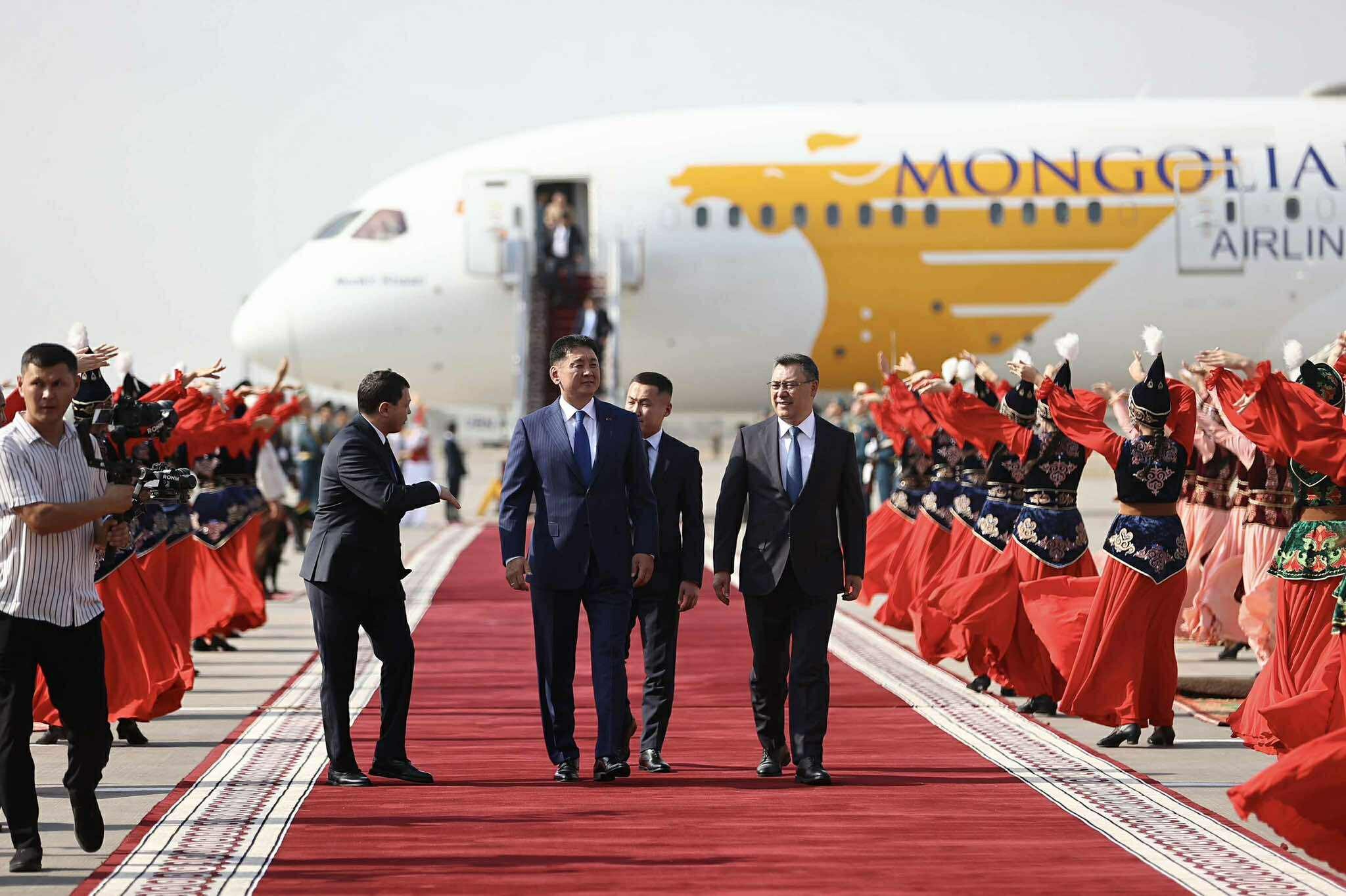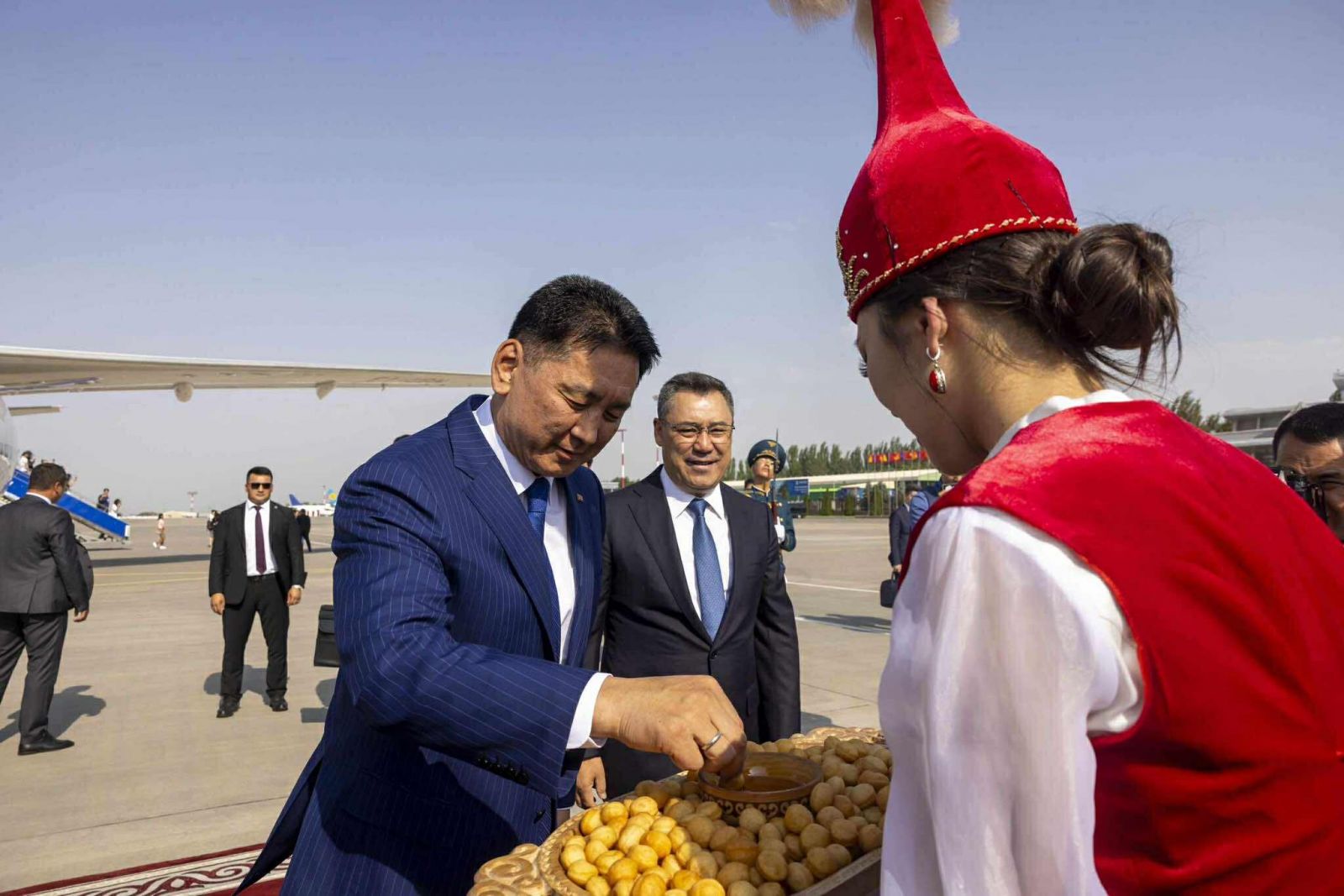 Ерөнхийлөгч У.Хүрэлсүх болон дагалдан яваа төлөөлөгчдийг Бишкек хотын “Манас” олон улсын нисэх онгоцны буудалд Бүгд Найрамдах Киргиз Улсын Ерөнхийлөгч С.Жапаров болон Монгол Улсаас тус улсад суугаа Онц бөгөөд Бүрэн эрхт Элчин сайд С.Ганхуяг, Бүгд Найрамдах Киргиз Улсаас Монгол Улсад суугаа Онц бөгөөд Бүрэн эрхт Элчин сайд А.Артыкбаев зэрэг албаны хүмүүс угтан авав.