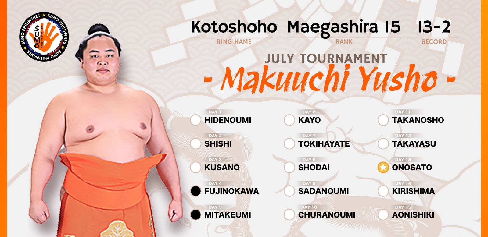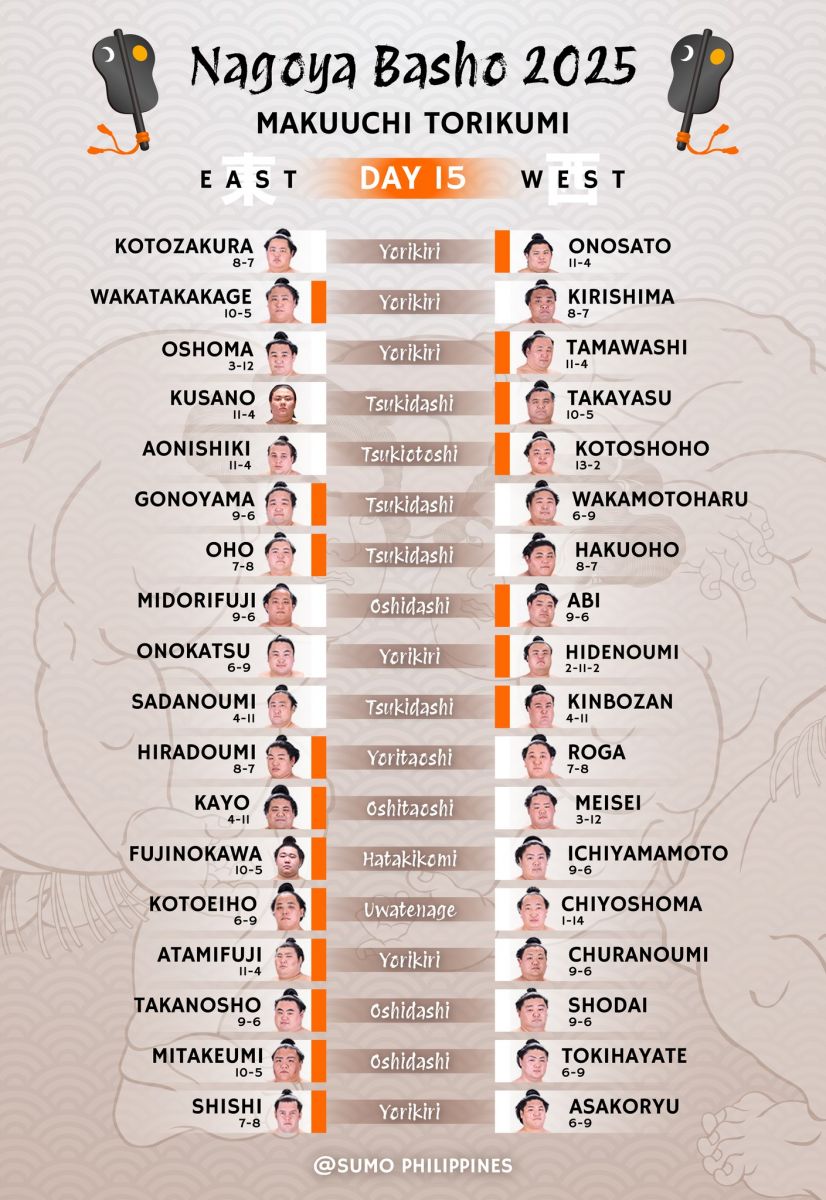 Мэргэжлийн сүмогийн Нагоя башёд сүүлийн 20 жилийн 19-д нь монгол сүмоч түрүүлсэн байлаа. Харин энэ удаад маэгаширагийн 15 дээр эрэмбэлэгдсэн буюу Макүүчи зиндааны хамгийн дор шахам бичигдсэн Котошёохо 13 даваа, 2 унаатайгаар түрүүллээ.