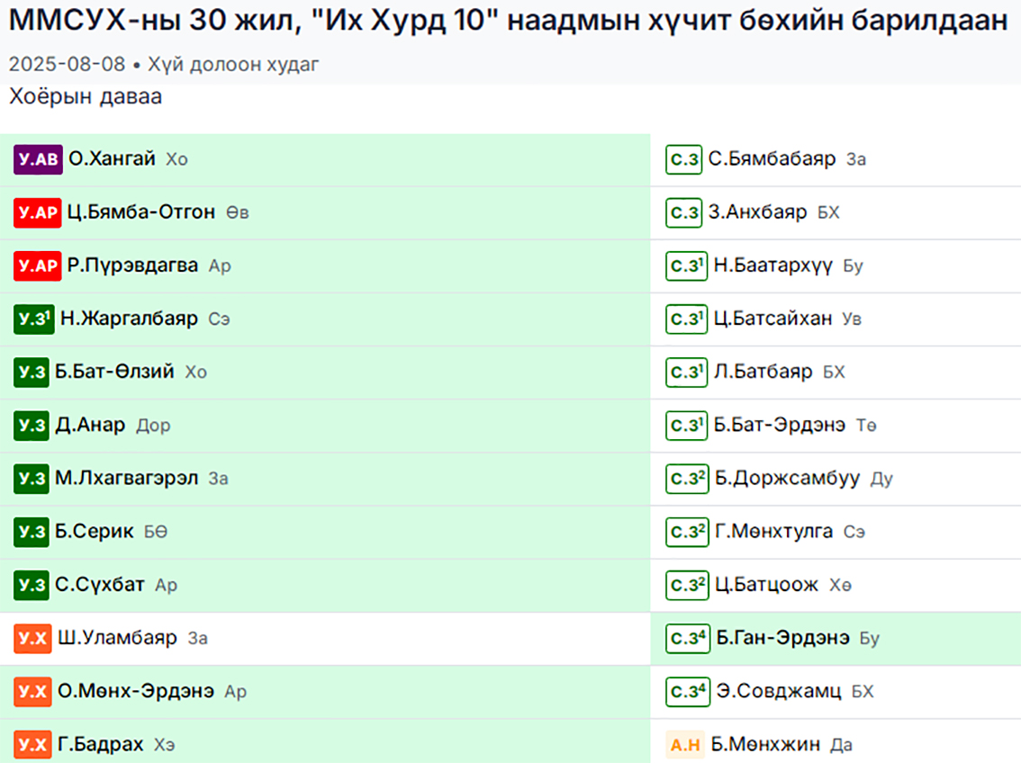 Өчигдөр эхэлсэн “Их хурд 10” наадмын хүчит 256 бөхийн толгойд дээрх таван бөх яг дарааллаараа боссон. Тэгвэл өнөөдөр “Их хурд 10”-ын бөхийн барилдаан өнжиж буй тул энэ боломжийг ашиглан Баянзүрх дүүргийн 60 жилийн ойн барилдаанд дээрх таван бөх мөн магнайлан барилдаж байна. Өнөөдөр Баянзүрхийн ой дуусна. Маргааш харин “Их хурд 10”-ын ой үргэлжлэх юм.
