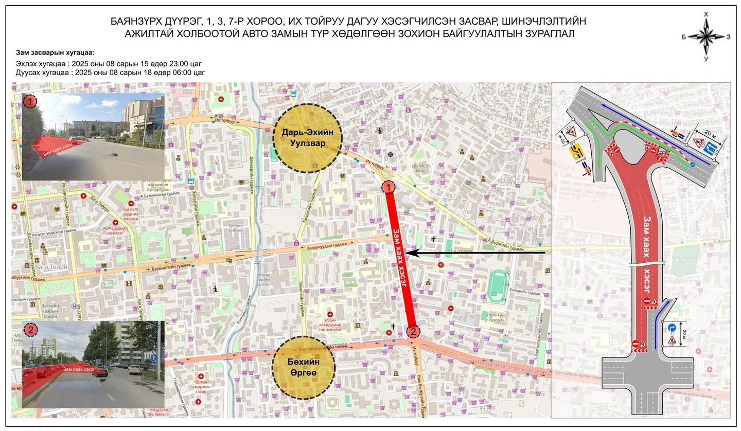 Нээх хугацаа: 2025 оны 8-р сарын 17-ны 06:00 цагийн хооронд хааж, авто замын зорчих хэсгийн тэгшилгээний үе, асфальтбетон хучилт, тэмдэглэгээ хийнэ.