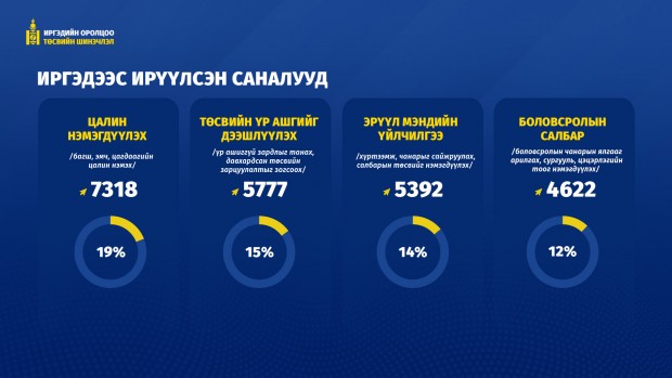 - Төрийн захиргааны зардлыг бууруулах, нийгмийн халамжийн салбарт хэмнэлт хийх шаардлагатай гэж иргэд саналаа өгчээ.