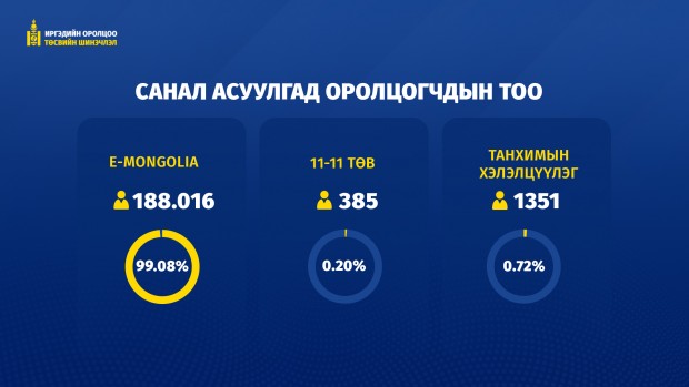 - Санал өгсөн иргэдийн 99.08 хувь нь E-Mongolia цахим систем ашиглажээ.
