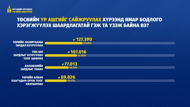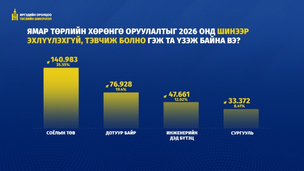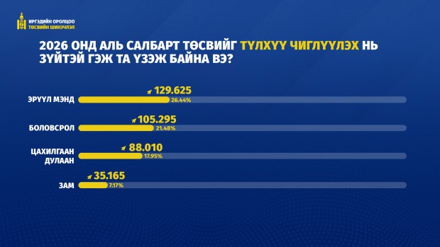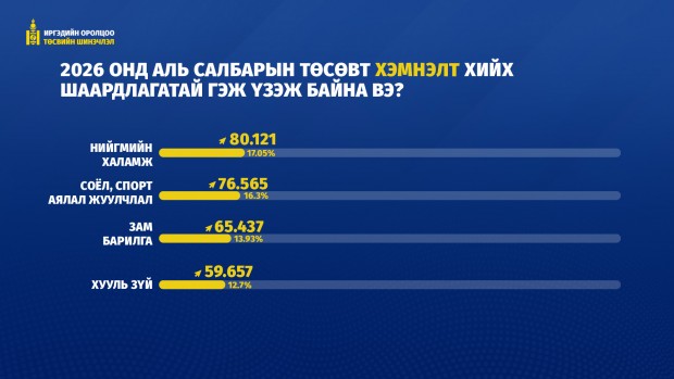 Монгол Улсын 2026 оны төсвийн төсөлд олон нийтээс авсан саналын үр дүнг танилцуулж байна.