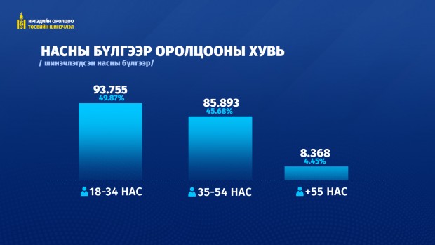 - Санал өгсөн иргэдийн 49.87 хувь нь 18-34 насныхан байна.