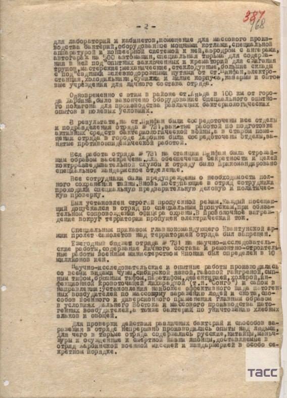 "Зөвлөлтийн цэргүүдэд олзлогдсон Японы армийн бактериологич мэргэжилтнүүдийн хэрэгтэй холбогдуулан Хабаровскийн хязгаарын Дотоод явдлын удирдах газар Японы цэргийн дарангуйлагчид Манжуур дахь түшиц газраа ашиглан Зөвлөлт Холбоот Улс руу халдан довтлоход зэхэж хүн амыг үй олноор устгах бактериологийн зэвсэг хэрэглэхэд идэвхтэй бэлтгэж байсныг шуурхай мөрдөн байцаалтаар тогтоосон байна. Тэд тахал, цусан халдвар (сибирийн язва), хийт гангрена, хижиг халууралт, гэдэсний хижиг, паратиф, цусан суулга, холера, халдварт цус алдалт (“Сонго” гэж нэрлэгддэг), сап зэрэг бүх төрлийн халдварт өвчнөөр шинжилгээ судалгаа, туршилтын ажил хийж байв. Бактерийн янз бүрийн нөлөөллийг шалгахын тулд хүн дээр байнгын туршилт хийж байсан бөгөөд үүний тулд отрядын шоронд орос, хятад, манжууд, мөн цаазын ял авсан япончуудыг маш нууц байдлаар авчран хорьж байжээ" хэмээн ЗХУ-ын ДЯЯ-ны Хабаровск мужийг хамаардаг газрын дарга, дэслэгч генерал Иван Долгих 1947 оны 2 дугаар сарын 1-ний өдрийн тусгай мэдээндээ дурдсан байна.