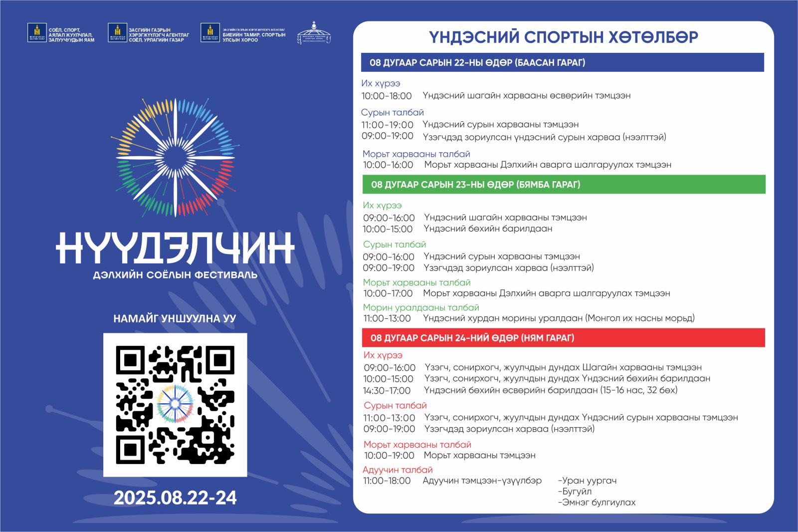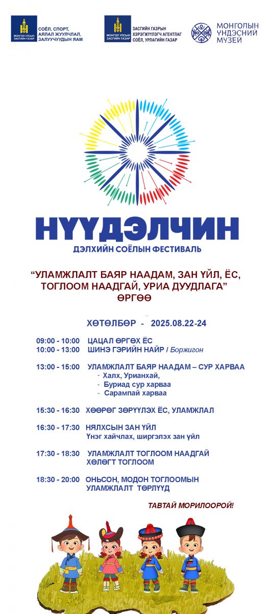 ЮНЕСКО-гийн “Соёлын биет бус өвийг хамгаалах тухай” 2003 оны конвенц, Соёлын өвийг хамгаалах тухай хуулийн 39 дүгээр зүйлийн 39.2 дахь заалт, Монгол Улсын Засгийн газрын 2024 оны 01 дүгээр сарын 25-ны өдрийн 41 дүгээр тогтоолыг хэрэгжүүлэх зорилгоор жил бүр уламжлал болгон зохион байгуулж буй “Нүүдэлчин” дэлхийн соёлын фестиваль Налайх дүүрэг, Тайж хайрхан уулын бэлд эхэллээ.