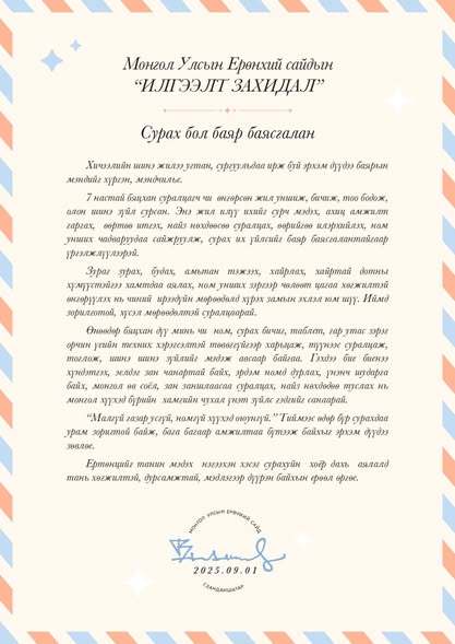 Монгол Улсын Ерөнхий сайд Г.Занданшатар шинэ хичээлийн жил эхлэж буйтай холбогдуулан мэндчилгээ дэвшүүлжээ. Мэндчилгээнд,