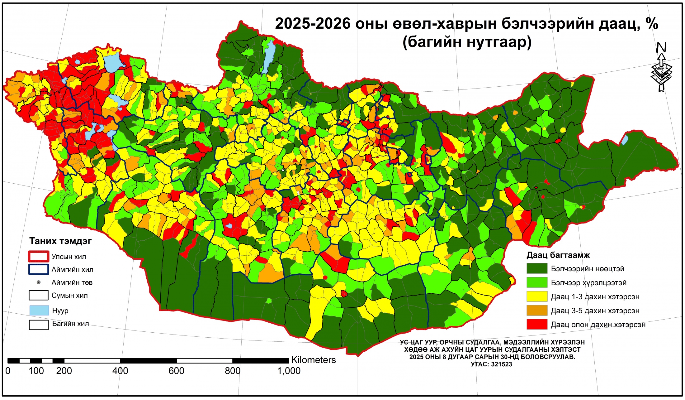 Ус цаг уур судалгаа мэдээллийн хүрээлэнгээс Засгийн газрын 286 дугаар тогтоолын дагуу 2025-2026 оны өвөл, хаврын бэлчээрийн даацыг баг бүрийн бэлчээрийн ургац, малын тоо, бэлчээрийн талбайн хэмжээ, бэлчээр ашиглах хугацаа зэрэг мэдээлэлд үндэслэн багийн нутгаар тооцоолон гаргасан байна. Зуншлагын байдал наймдугаар сарын 20-ны байдлаар нийт нутгийн 54 хувьд хэвийн, нутгийн 46 хувьд гантай болон гандуу байна.
