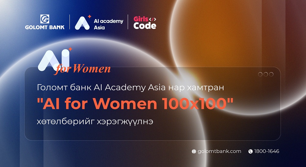"AI for Women 100x100" хиймэл оюуны чиглэлээрх хөтөлбөрийг AI Academy Asia санаачлан Голомт банкны дэмжлэгтэйгээр хэрэгжүүлэх гэж байна. Энэхүү хөтөлбөр хиймэл оюуны чиглэлээр суралцах болон мэргэших хүсэл эрмэлзэлтэй 100 эмэгтэй сурагч болон ерөнхий боловсролын сургуулийн 100 эмэгтэй багшийг хамруулах бөгөөд энэ чиглэлээр системтэйгээр бэлтгэх юм.