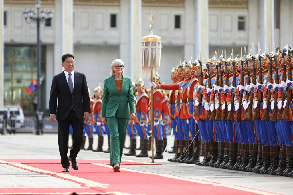 Монгол Улсын Ерөнхийлөгч У.Хүрэлсүх гэргий Л.Болорцэцэгийн хамт Австралийн Холбооны Улсын Амбан захирагч Саманта Мостин, нөхөр Симеон Бэкэтт нарыг жанжин Д.Сүхбаатарын талбайд албан ёсоор угтан авлаа.