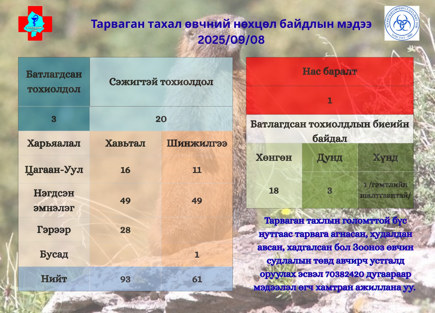Хөвсгөл аймгийн Цагаан-Уул сумын Шарга багийн нутаг "Тагийн нуур" гэдэг газар /Аймгийн төвөөс баруун урд зүгт 152км, сумын төвөөс баруун урд зүгт 30км/-т тарваган тахлын хүний өвчлөлийн тохиолдол гарч, нэг хүн амь насаа алдаж, 88 хүний PCR шинжилгээний хариу эерэг гарсан тул өчигдөр /2025.09.07/ шөнө тус аймгийн Онцгой комисс шуурхай хуралдаж, 72 цагийн хатуу хөл хорио тогтоон аймаг руу орох гарах хөдөлгөөнийг хязгаарлаад байна.
