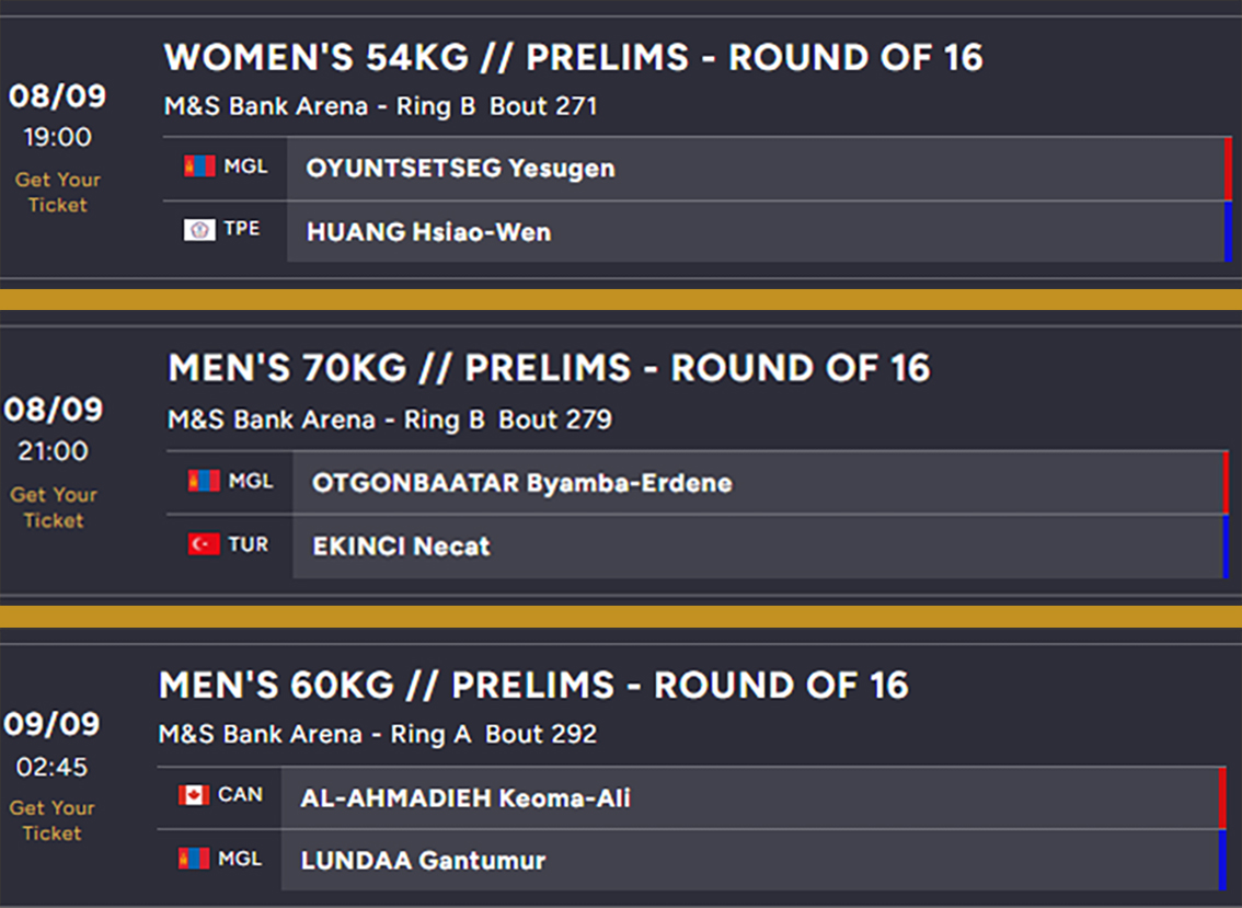 Эмэгтэйчүүдийн 54 кг-ын жинд О.Есүгэн Хятадын Тайванийн Хуан Сиа Вэнтэй Улаанбаатарын цагаар 19:00-ээс тоглоно. Тэгвэл эрэгтэйчүүдийн 70 кг-д О.Бямба-Эрдэнэ Европын мөнгөн медальт, Туркийн Нецат Екинчитэй 21:00-ээс тулаан эхлэх бол шөнө дунд 02:45-аас эрэгтэйчүүдийн 60 кг-ын жинд Г.Лундаа Канадын араб гаралтай Аль-Ахмади Кеома Алитай тоглох болно.
