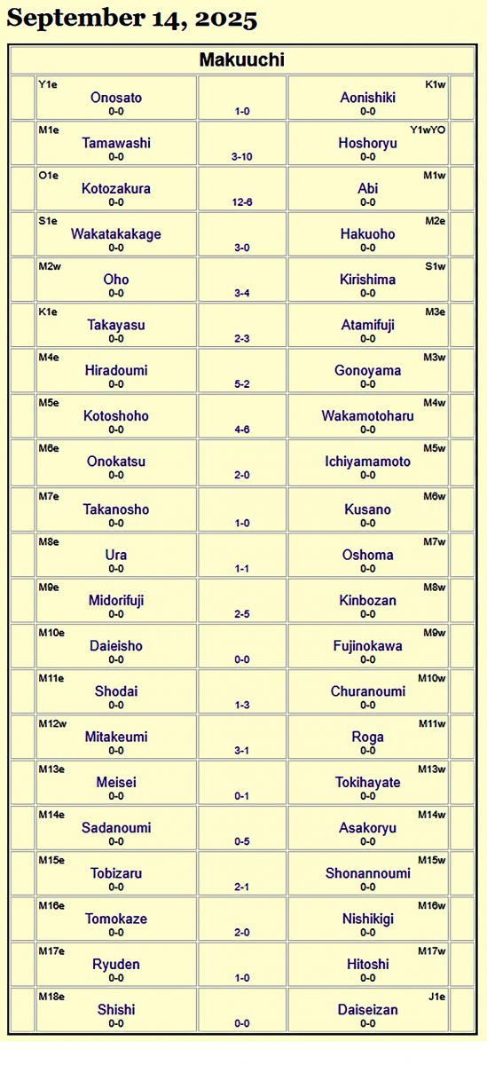 Мэргэжлийн сүмогийн есдүгээр сарын башё энэ сарын 14-нд буюу ирэх ням гаригт эхэлнэ. Эхний хоёр өдрийн оноолтыг зарлалаа. Эхний өдрийн сүүлчийн барилдаанд дохё дээр ёкозүна Ооносато, шинээр комүсүби цол хүртсэн Украины Аонишики нарыг тааруулжээ. Ёкозүна цолтонтой башёгийн эхний өдөр шинэ комүсүби цолтныг оноодог уламжлалын дагуу таарсан байна.