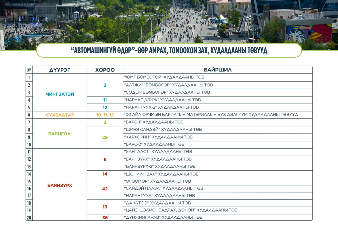 Тодруулбал: Бөмбөгөр-1, Бөмбөгөр-2, Юмт, Содон, Алтжин бөмбөгөр, Нарантуул худалдааны төв, Дүнжингарав худалдааны төв, Өгөөмөр зах, Сандэй плаза ХТ, Шөнийн зах, Баянзүрх ХТ, Баянзүрх-2 ХТ, 100 айл орчмын барилгын материалын бүх дэлгүүр, Барс-1, 2 худалдааны төв, Хархорин, Шинэ сандэй, Ханталст, Да хүрээ зах, Цайз, Цолмонбадрах, Доной модны зах, Нарлаг дэнж, Нарантуул-2 зах ажиллахгүй.