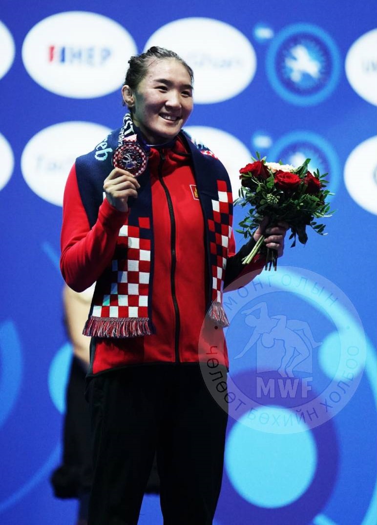 Шөвгийн 16-д Казахстаны Виктория Хусайноваг 9:1-ээр, шөвгийн наймд Германы Елена Брюггерийг цэвэр ялсан. Харин шөвгийн дөрөвт Японы Сакура Онишид ялагдаж, хүрлийн төлөө барилдахаар шалгарсан юм. Дэлхийн аваргын хүрэл медаль хүртчихээд дэвжээнээс нулимстай буугаад багшдаа тэврүүлэхдээ "Багшдаа баярлалаа" гэж хэлсэн нь баярт мөчийг улам чимсэн сэтгэл догдлуулам агшин байлаа.