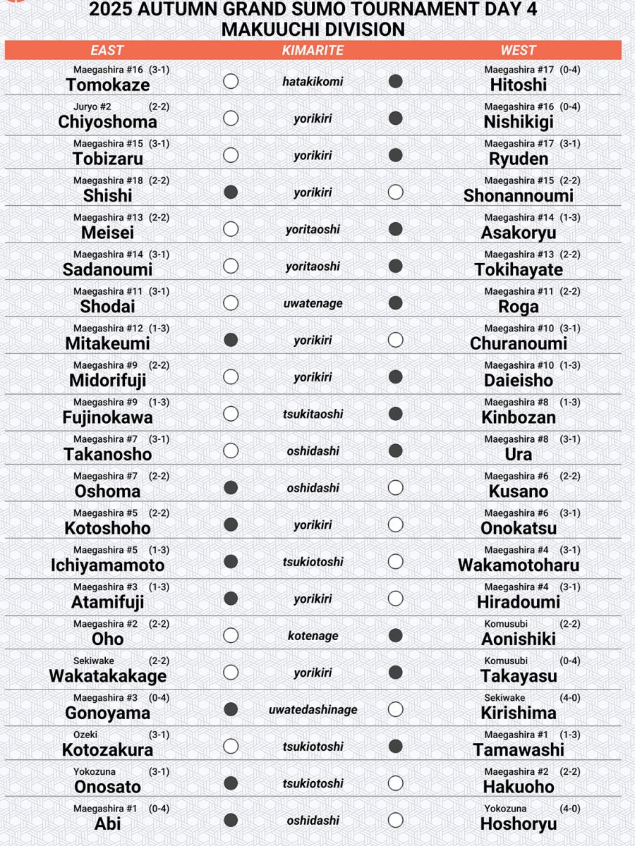 Гэвч дөрөв дэх өдөр ялагддаг заншилтай шахам болчихсон ёкозүна Ооносато маэгаширагийн хоёр дээр эрэмбэлэгдсэн Хакүоход дахин ялагдлаа.