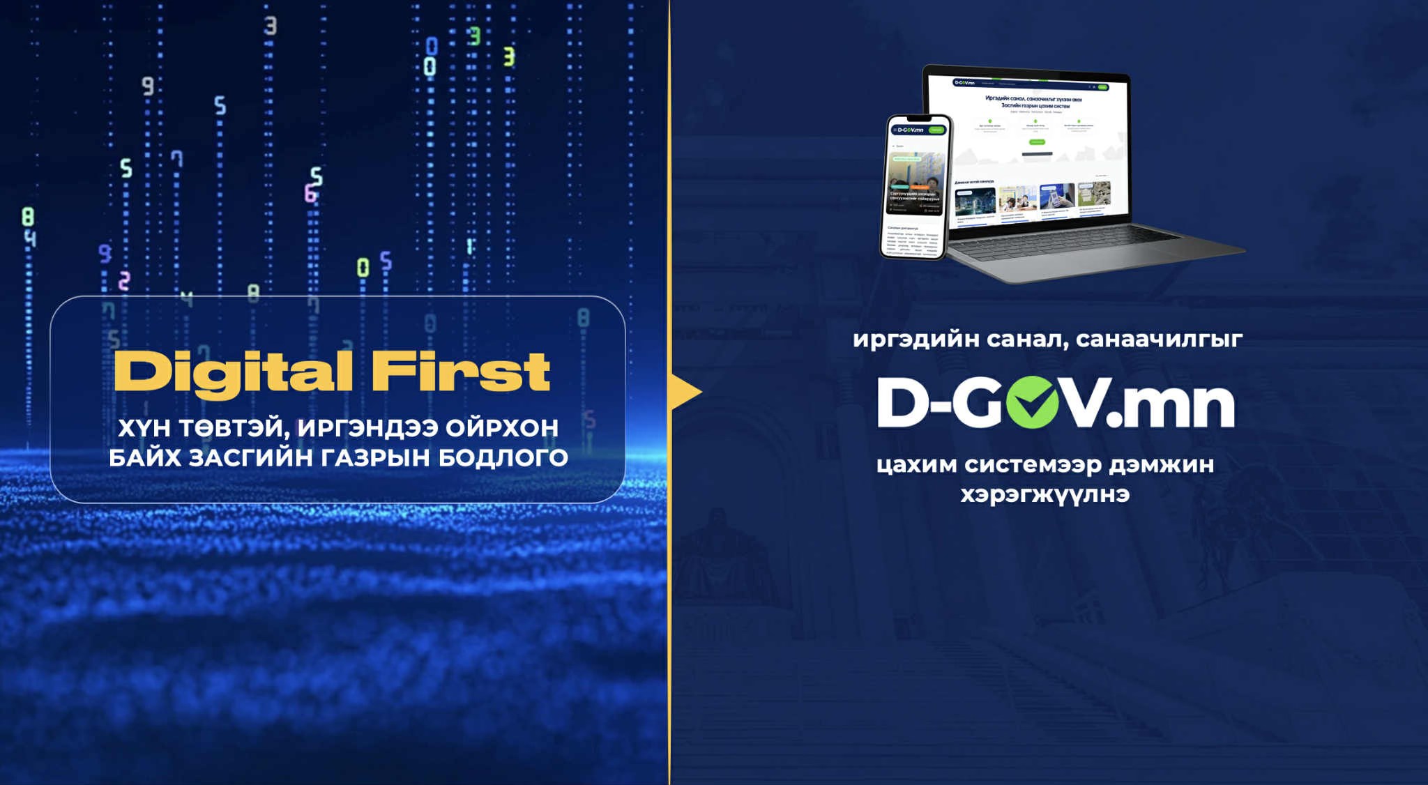 “Цахимаар түрүүнд (Digital First)” уриалга нь Монгол Улсын урт, дунд хугацааны хөгжлийн бодлогын баримт бичигт заасан цахим шилжилт, дэвшилтэт технологи нэвтрүүлэхтэй холбоотой зорилго, зорилтыг хэрэгжүүлэхэд баримтлах зарчим болох юм.