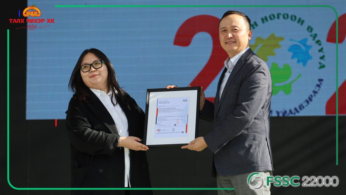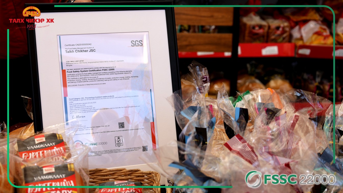 Монгол Улсын хүнсний үйлдвэрлэлийн салбарт түүхэн хуудсыг “Талх Чихэр” ХК нээлээ. Тус компани нь хүнсний аюулгүй байдлын иж бүрэн менежментийн тогтолцоо FSSC 22000 (V.6) стандартыг амжилттай нэвтрүүлж, гэрчилгээ авсан Монголын анхны гурилан бүтээгдэхүүн үйлдвэрлэгч компани боллоо.