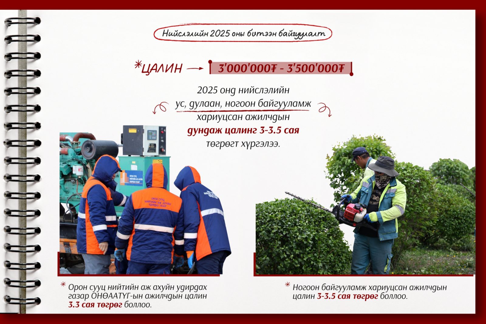 Нийслэлээс 2025 онд ногоон байгууламж хариуцсан ажилчдын цалинг 3-3.5 сая төгрөг, Орон сууц нийтийн аж ахуйн удирдах газар ОНӨААТҮГ-ын ажилчдын дундаж цалинг 3.3 сая төгрөг болгож нэмэгдүүллээ. Нийслэлийн есөн дүүрэгт нийт 157 га талбайд ногоон байгууламжийн арчилгааны 27 байгууллага 320 ажилтантай ажилладаг. Ногоон байгууламжийн арчилгаа хариуцсан ажилчид сард 1.7-1.9 сая төгрөгийн цалин авдаг байсныг нийслэлийн Засаг даргаас өгсөн үүрэг чиглэлийн дагуу нэмэгдүүлж, 3.5 сая төгрөгт хүргэсэн. Мөн ногоон байгууламжийн 1 га талбайн арчилгааны үнэлгээ 100 орчим сая төгрөг байсныг 150 сая төгрөг болгож нэмэгдүүлсэн юм.