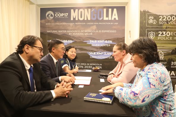 Байгаль орчин, уур амьсгалын өөрчлөлтийн сайд Б.Батбаатар, Дэлхийн банкны Уур амьсгалын өөрчлөлтийн асуудал хариуцсан дарга Валериа Хиккейтэй ирэх оны 8 дугаар сарын 17-28-ны өдрүүдэд Улаанбаатар хотноо зохион байгуулагдах Цөлжилттэй тэмцэх тухай НҮБ-ын конвенцын Талуудын 17 дугаар бага хурлын бэлтгэл ажлын хүрээнд уулзалт хийлээ.