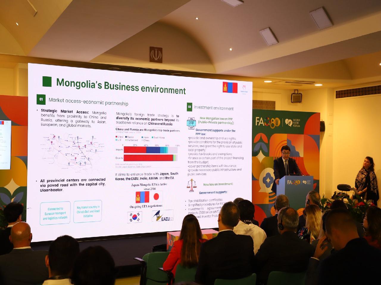Хүнс, хөдөө аж ахуй, хөнгөн үйлдвэрийн яамны Төрийн нарийн бичгийн дарга Т.Жамбалцэрэн НҮБ-ын Хүнс, хөдөө аж ахуйн байгууллага (ХХААБ)-ын Итали Улсын Ром хот дахь төв байранд зохион байгуулагдсан “Гараас гарт” хөрөнгө оруулалтын форумын үеэр Монгол Улсын Хүнс, хөдөө аж ахуйн хөрөнгө оруулалтын төлөвлөгөөг танилцууллаа.