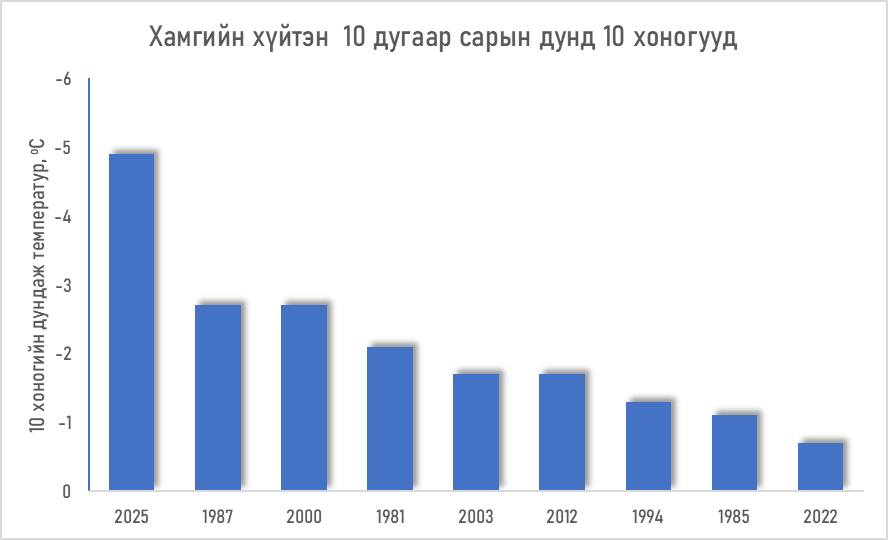 Аравдугаар сарын дунд 10 хоногийн /2025.10.11-20/ агаарын дундаж температур +2 градус дулаан байдаг бол энэ жил дундаж температур -6.9 градусаар хүйтэн буюу -4.9 градус байлаа. Энэ нь 1981 оноос хойших хамгийн хүйтэн 10 хоног болсон гэсэн үг юм.